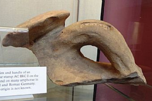Larger amphorae could hold up to 80 litres but the usual capacity was more like 25 to 30 litres which would weigh about 25 to 30 kg. Their shapes are globular; squat, rounded at the top and slightly tapering to the base; and tall and narrow, either cylindrical or tapering. They had a pointed base to steady them in the ground and aid lifting. They were lifted by two handles, one on each side of the rim and this was often a task for two people because a full amphora would be very heavy. In our example we have just the one handle and part of the rim.